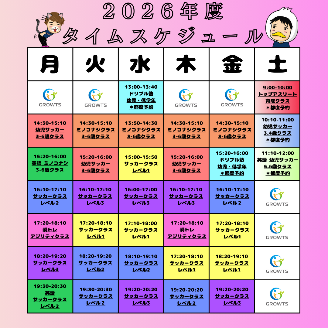 2026年4月〜のスケジュール*すでに定員となっているクラスもございます